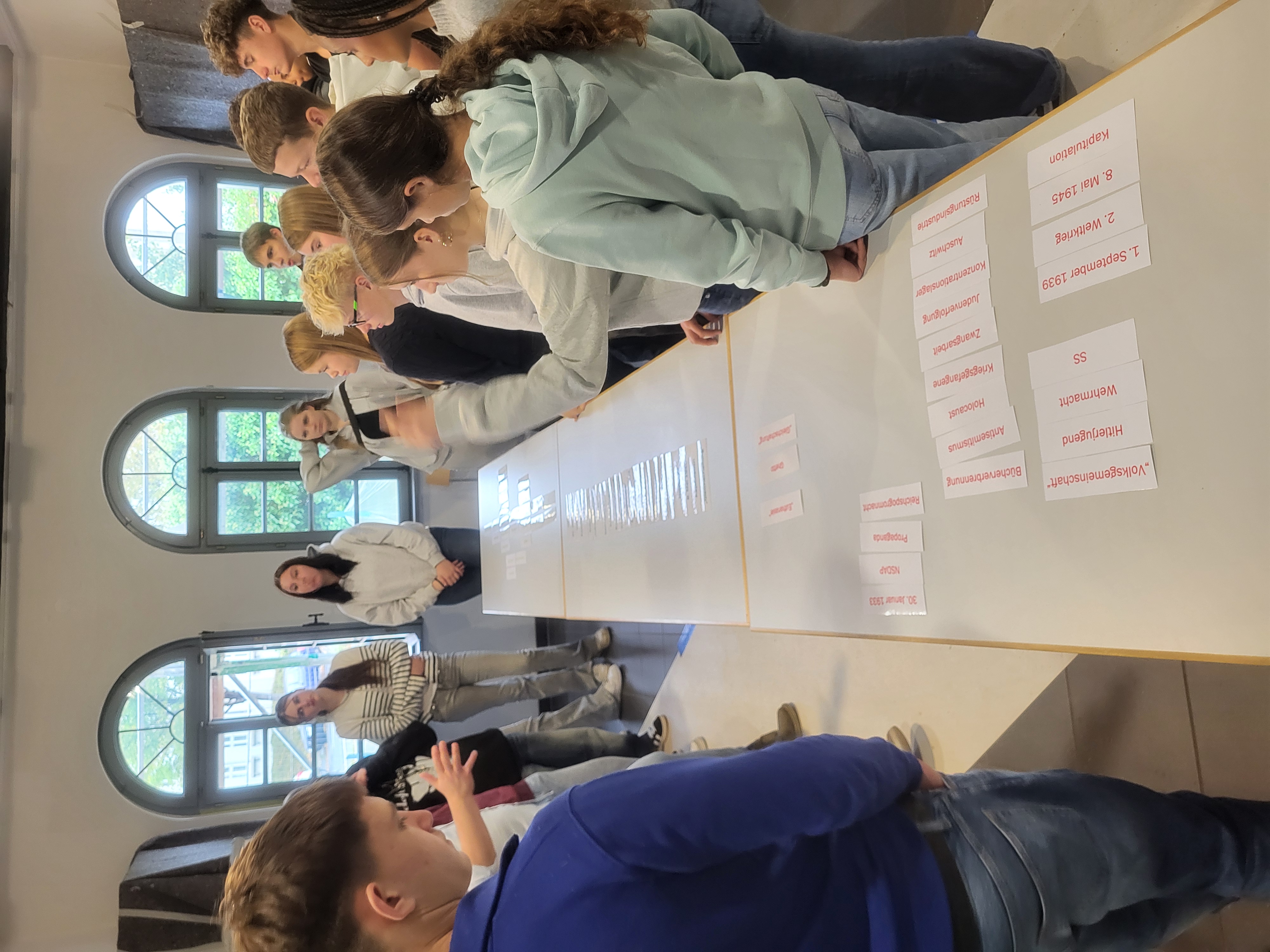 Am Montag waren wir, die Klasse 10.4, in der Gedenkstätte Schillstraße in Braunschweig, um mehr über die Zeit des Nationalsozialismus zu erfahren. Die Gedenkstätte war zwischen 1944 und 1945 ein Außenlager des Konzentrationslagers Neuengamme bei Hamburg. Am Anfang haben wir ein kleines Brainstorming gemacht, um in das Thema einzusteigen. Dabei ging es um Fragen wie „Welche Aufgaben könnten die Mitarbeitenden von Gedenkstätten haben?“ oder „Woran denke ich, wenn ich „Zeit des Nationalsozialismus“ höre?“ Danach haben wir Kärtchen mit Begriffen wie zum Beispiel Antisemitismus, Holocaust, Bücherverbrennung etc. so sortiert, wie es für uns Sinn machte und haben dies dann gemeinsam ausgewertet.