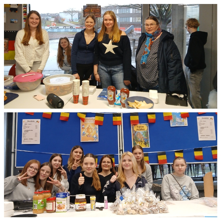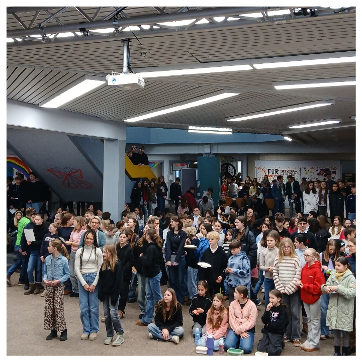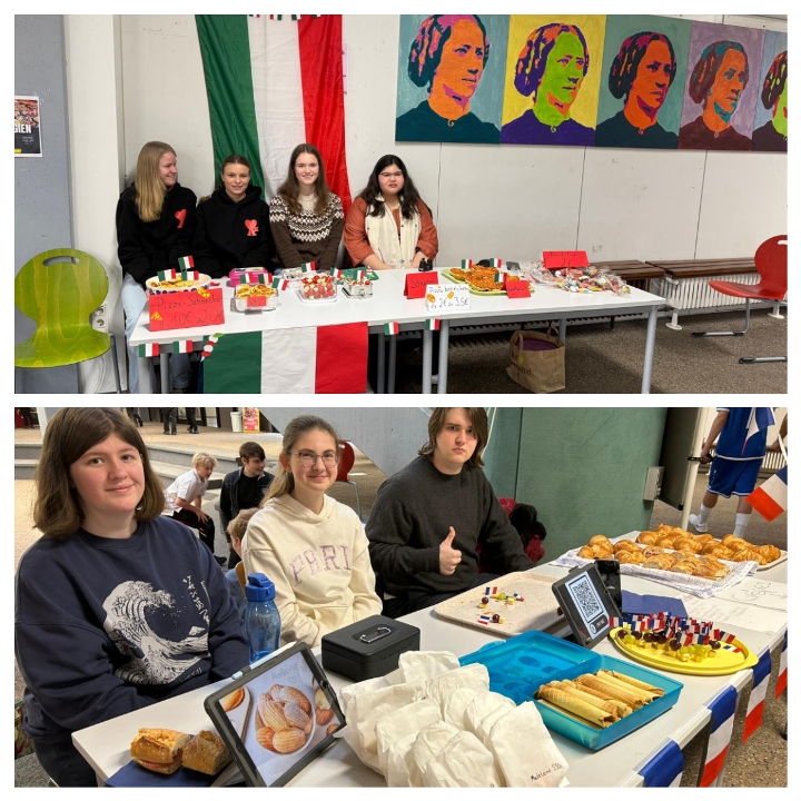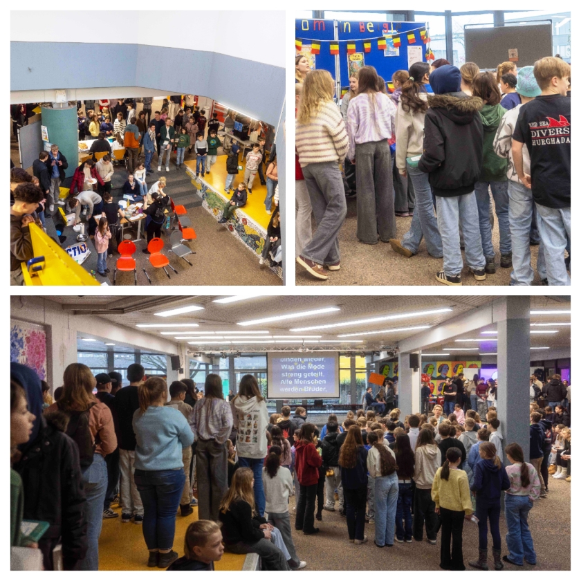 Den gemeinsamen Auftakt bildete das Singen der „Ode an die Freude“. Im Forum versammelte sich die Schulgemeinschaft und setzte mit der Europahymne ein sichtbares Zeichen für Zusammenhalt und Verbundenheit. Im Anschluss verwandelte der 10. Jahrgang das Forum in einen European Street Food Market. Spezialitäten aus der Türkei, Belgien, Frankreich, Italien und Deutschland luden zum Probieren ein. Informationen zu Kultur, Musik und landestypischen Besonderheiten ergänzten das kulinarische Angebot. Der Wahlpflichtkurs Verantwortung von Herrn Schlesinger aus Jahrgang 9 übernahm den Getränkeverkauf. Die Erlöse fließen in die Jahrgangskasse des 10. Jahrgangs und unterstützen den geplanten Abschlussball.