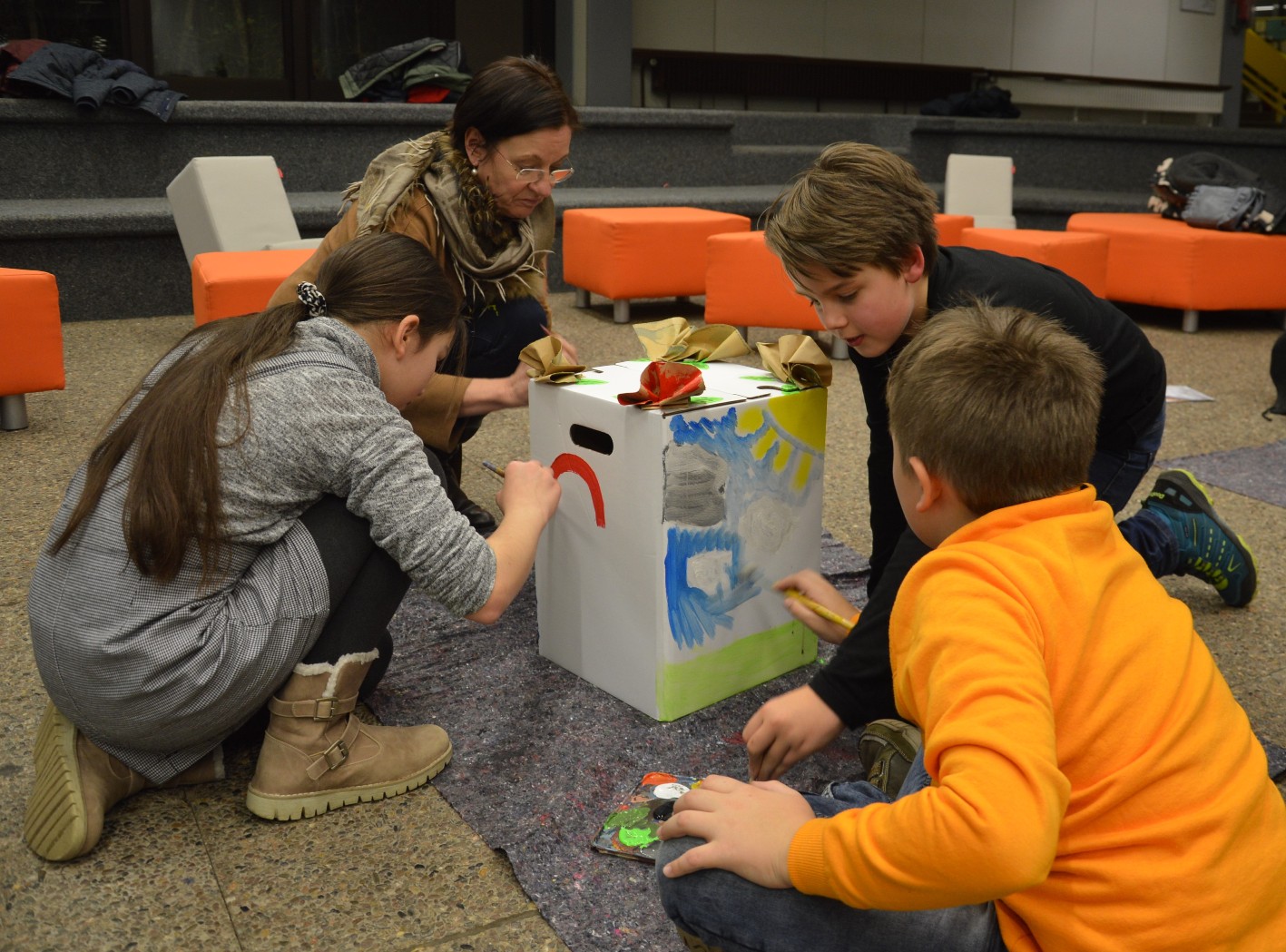 Raum zu schaffen für interreligiösen Dialog ist eines der Anliegen dieser Aktion. Und so freute sich das Organisationsteam um die Lehrkräfte Paula Schuseil, Michael Schneider und Beate Schneider, dass sie in diesem Jahr mit Renate Wagner-Redding, Sadiqu Al-Mousllie und Olaf Schäper Vertreter dreier unterschiedlicher Religionen begrüßen durften. Im Rahmen einer gemeinsamen kreativen Aktion haben Schüler, Lehrer, Eltern und die geladenen Gäste Sitzhocker mit Bildern, Wörtern, Farben und Leitsprüchen zu dem Thema „Mensch, es ist dir gesagt, was gut ist“ gestaltet. Alle Beteiligten betonten, wie wichtig in der heutigen Zeit die gegenseitige Wertschätzung sowie Toleranz und Respekt unter den verschiedenen Religionen sind. Unterstützt wurde das Organisationsteam, das mit seiner Veranstaltung ein Zeichen für Frieden und gegenseitiges Verständnis setzen wollte, von Schülerinnen und Schülern des 6. und des 12. Jahrgangs. Die älteren Schüler zeichneten auch für den gemeinsamen gemütlichen Abschluss bei Punsch und Pizza verantwortlich.