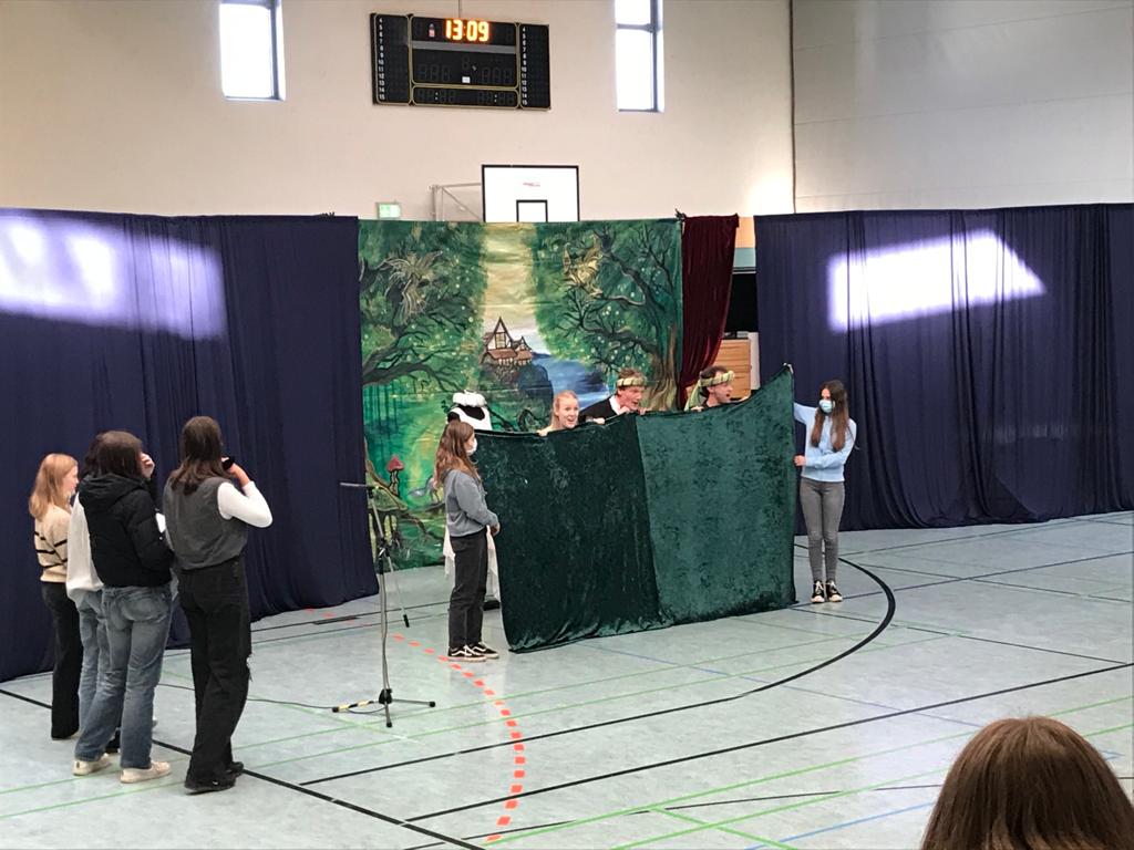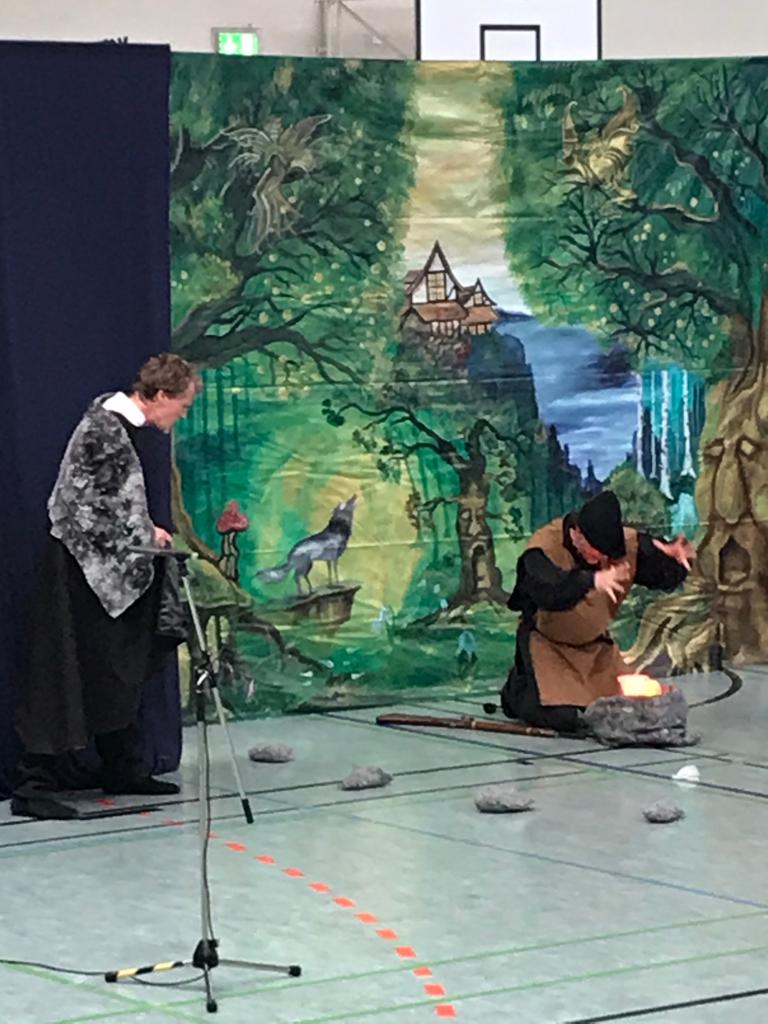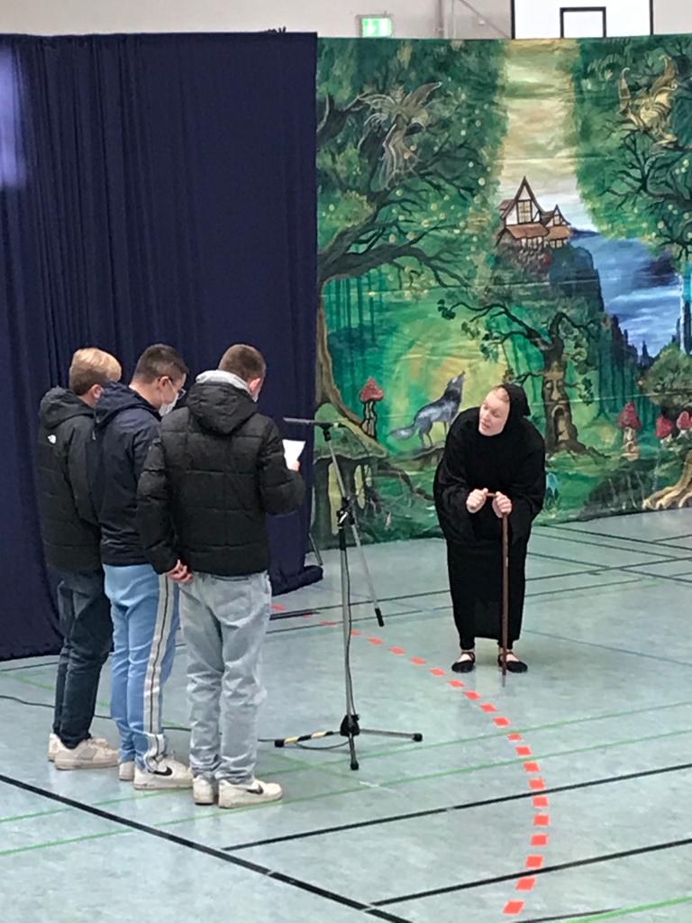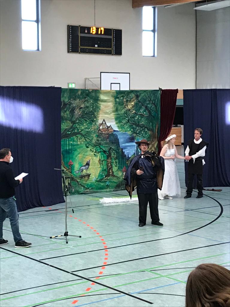 Düster und zugleich farbenfroh und sehr schülerorientiert präsentierte das kleine Team der „Jungen Oper“ ein Singspiel zum Anfassen und Mitmachen in unserer Sporthalle. Dabei gab es einiges zum Lachen und einiges zum Lernen. Die drei MusikerInnen sangen und spielten dabei aber nicht nur selbst, sondern holten auch ein paar Schülerinnen als Brautjungfern und 3 Schüler als Jäger auf die Bühne.