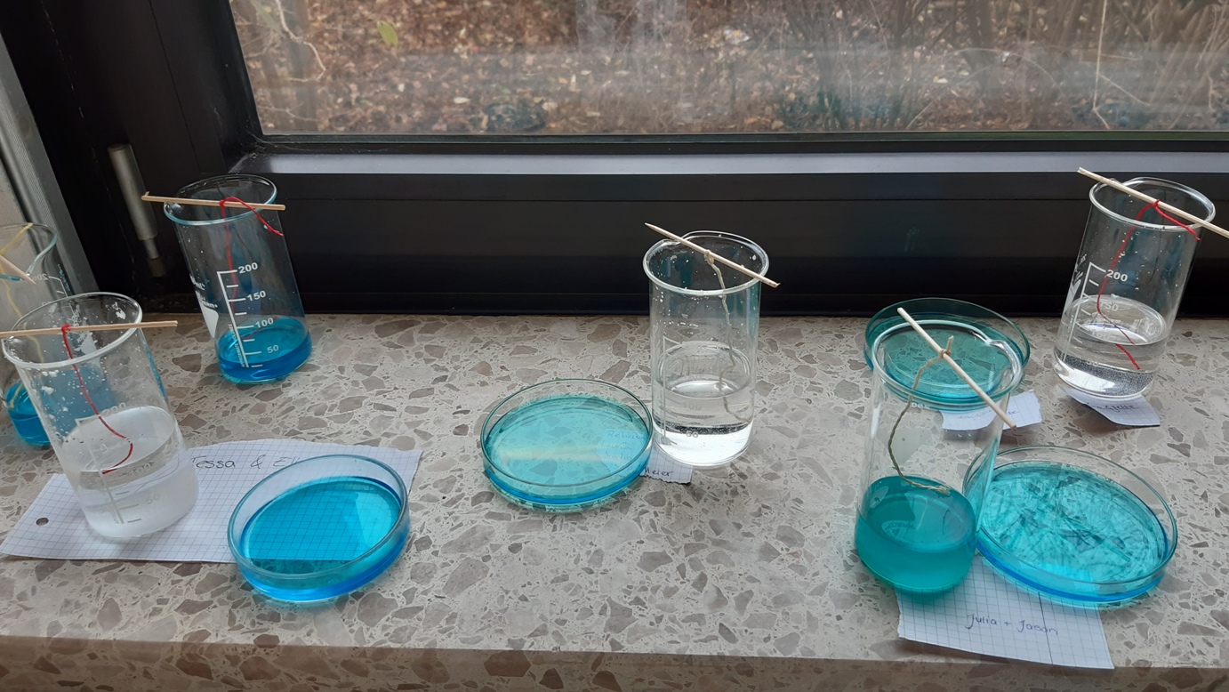 Der Fit4Future-Kurs „Naturwissenschaften fördern“ hat passend zum aktuellen Chemie-Thema des Fachunterrichts Stoffe untersucht und mit einander reagieren lassen: Der Langzeitversuch mit Kochsalz (weiß) und Kupfersulfat (blau) wird die unterschiedlichen Salzstrukturen (Kristall-/Ionengitter) zeigen. Die Boxen haben wir für Mehlstaub-Explosionen gebaut, heftigen Verbrennungen von Mehl, die in Mühlen wie in Rüningen verhindert werden müssen.