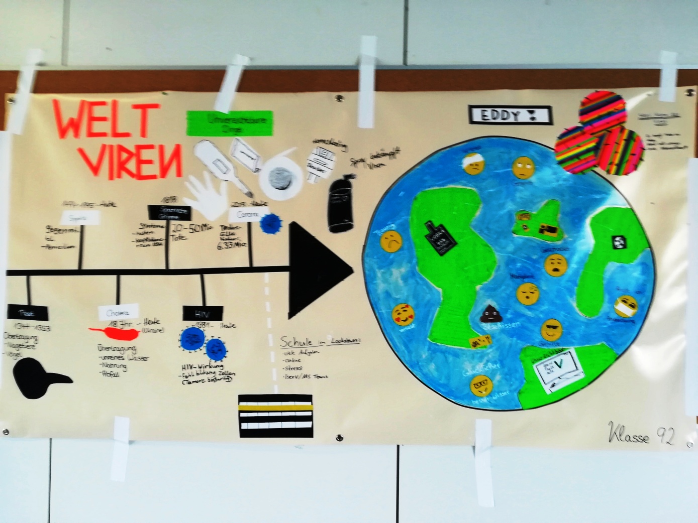 Unter Anleitung wurde auf einer Plane ein großes Schau-Bild entworfen, das einen Zeitstrahl der tödlichen Pandemien in den letzten 700 Jahren und außerdem eine Weltkugel mit selbstentworfenen Emojis zeigt.