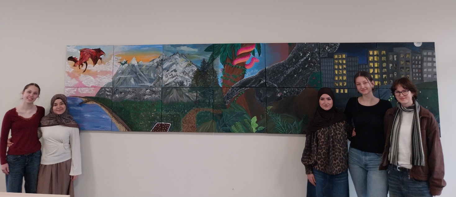 Nachdem die Lounge im ersten Stock mit einem entspannenden Strandmotiv durch Oberstufenschüler von Frau Schulz verschönert wurde, hat nun auch das Foyer im EG an Gemütlichkeit gewonnen. Der Kunst eA 2026 hat mit viel Engagement, auch während zwei Homeschooling-Tagen, ein mehrteiliges Gemälde für das Foyer geschaffen.