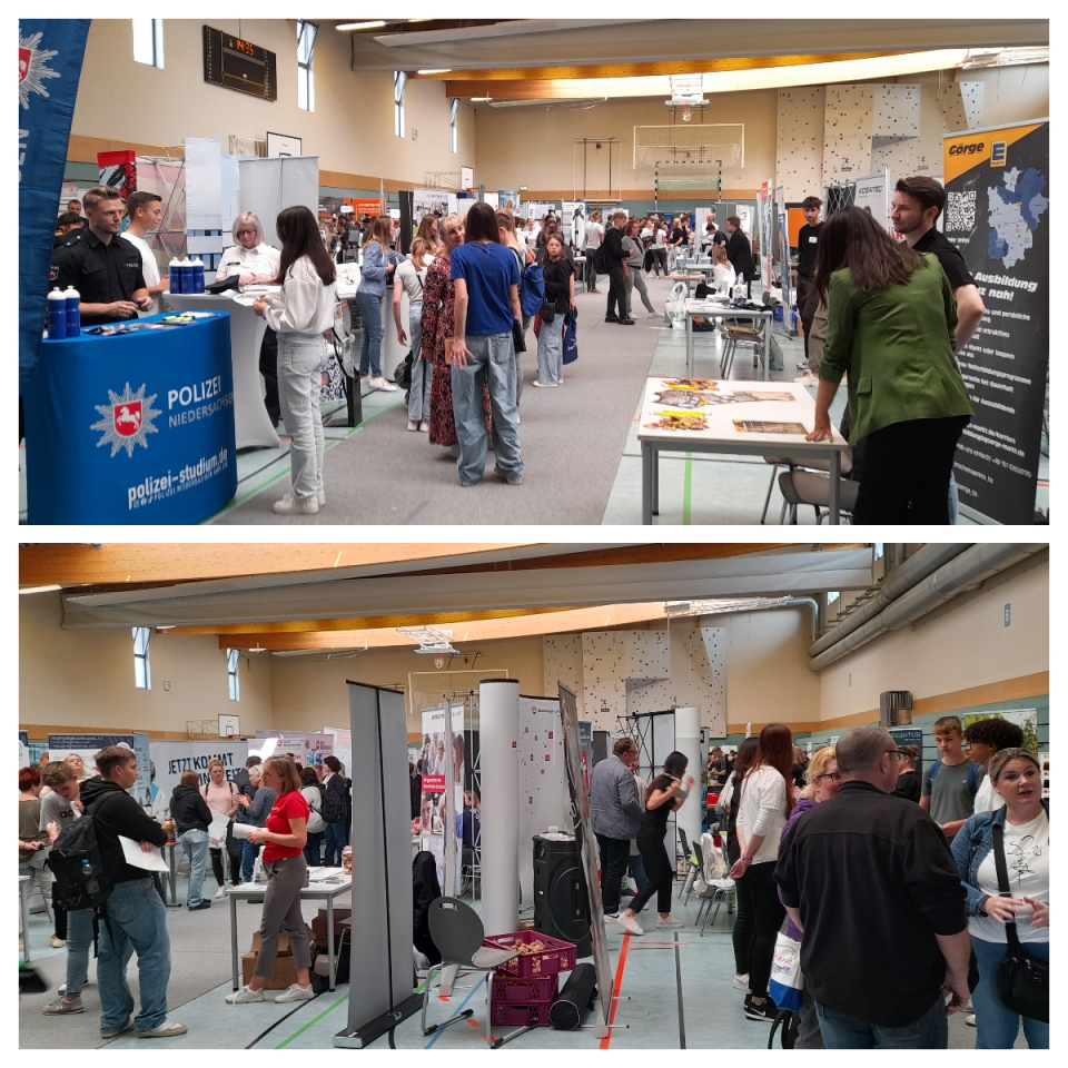 Am Mittwoch fand an der Henriette-Breymann-Gesamtschule unsere jährliche Berufsfindungsmesse für die Klassen 8 bis 13 statt. Über 80 Aussteller präsentierten ihre Ausbildungs- und Studienmöglichkeiten. Die Schüler:innen hatten die Gelegenheit, sich intensiv über verschiedene Berufswege und Bildungsangebote zu informieren.