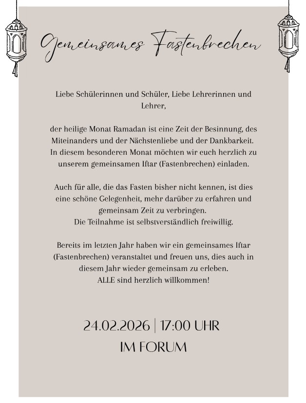 Anlässlich des bevorstehenden muslimischen Fastenmonats Ramadan (Beginn um den 18.02.) möchten wir die Schulgemeinschaft zum zweiten gemeinsamen Fastenbrechen am 24.02.26 einladen. Die Organisation und Gestaltung übernehmen größtenteils unsere Schüler*innen aus den verschiedensten Jahrgängen, die mit viel Mühe und Engagement dabei sind. Es ist uns ein großes Anliegen sie beim Gelingen dieses Vorhabens zu unterstützen und wir hoffen auch, viele von euch an dem Abend begrüßen zu können. Bitte melden Sie sich /meldet euch an: Anmeldeformular.