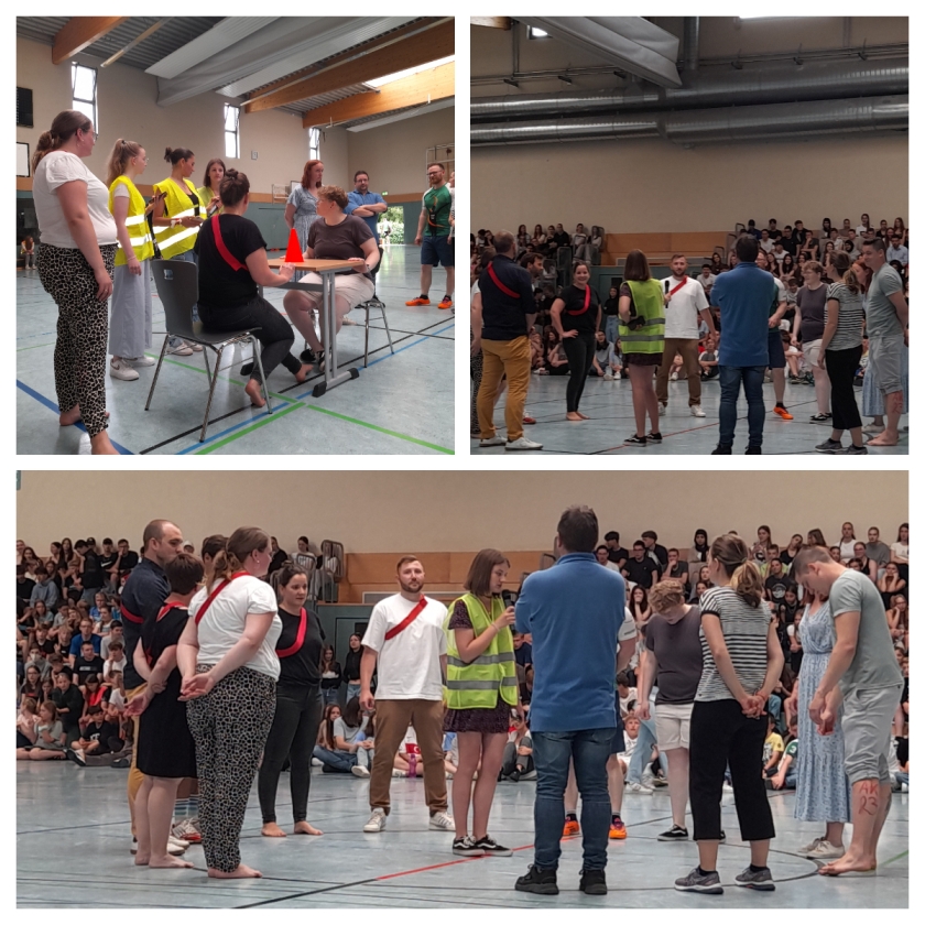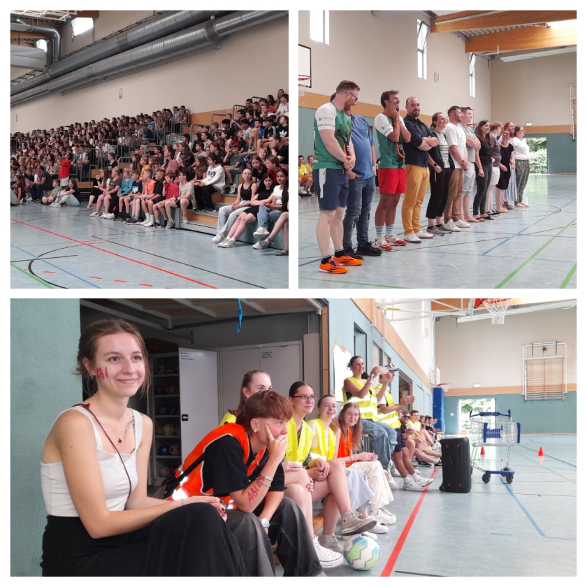 Mit kurzweiligen Wettbewerben wie Matten-Rutschen, Elfmeterschießen und Spielen wie Reise nach Jerusalem unterhielten unsere Abschlussjahrgänge die Schüler:innen und Lehrer:innen dann in der 3. und 4. Stunde bestens. Hierbei traten zwei hochmotivierte Lehrer:innenteams gegeneinander an; insbesondere Herr Stagge konnte seine zahlreichen Fans begeistern, die ihn auch lautstark zu weiteren Höchstleistungen anspornten.