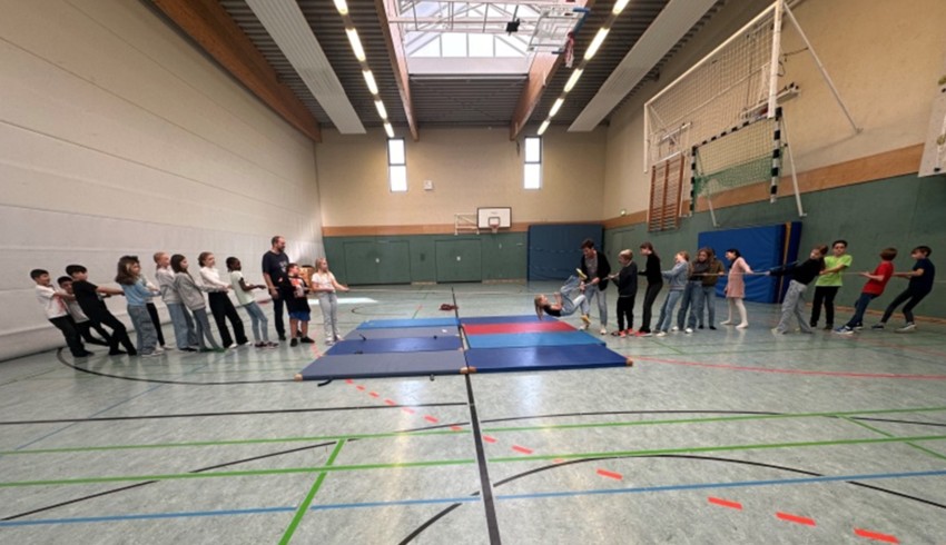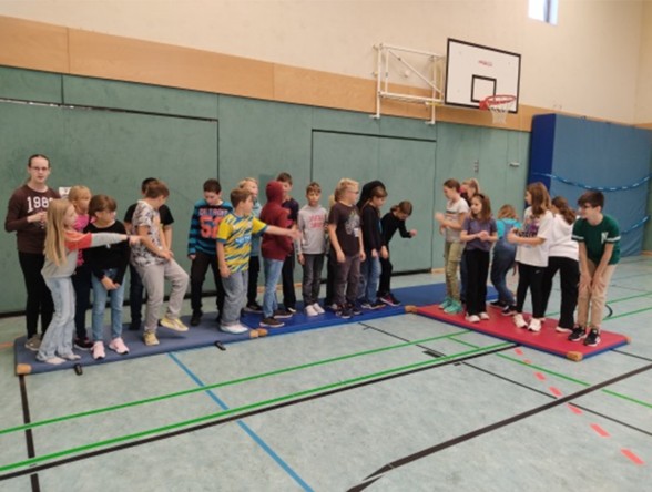 Mit Unterstützung der beiden Schulsozialarbeiter*Innen Frau Costa und Herrn Schroers absolvierten die Klassen unterschiedliche Aufgaben, welche nur gemeinsam als Team und mit gegenseitiger Hilfe zu bewältigen waren. So sollten die Schülerinnen und Schüler die Sporthalle durchqueren, ohne dabei den Hallenboden zu berühren. Einziges erlaubtes Hilfsmittel dafür waren Sportmatten, mit denen sie sich bewegen konnten.