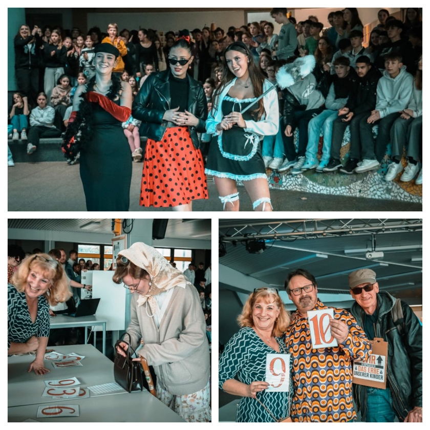Der erste Tag der Mottowoche des 13. Jahrgangs stand ganz im Zeichen einer Zeitreise. Farbenfrohe Kostüme entführten das Publikum in verschiedene historische Epochen und in die Zukunft. Jula gewann mit einer überzeugenden Darstellung von sich als rüstige Seniorin in 70 Jahren.