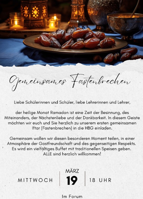 anlässlich des bevorstehenden muslimischen Fastenmonats Ramadan möchten wir die Schulgemeinschaft zu einem (unserem ersten) gemeinsamen Fastenbrechen einladen.