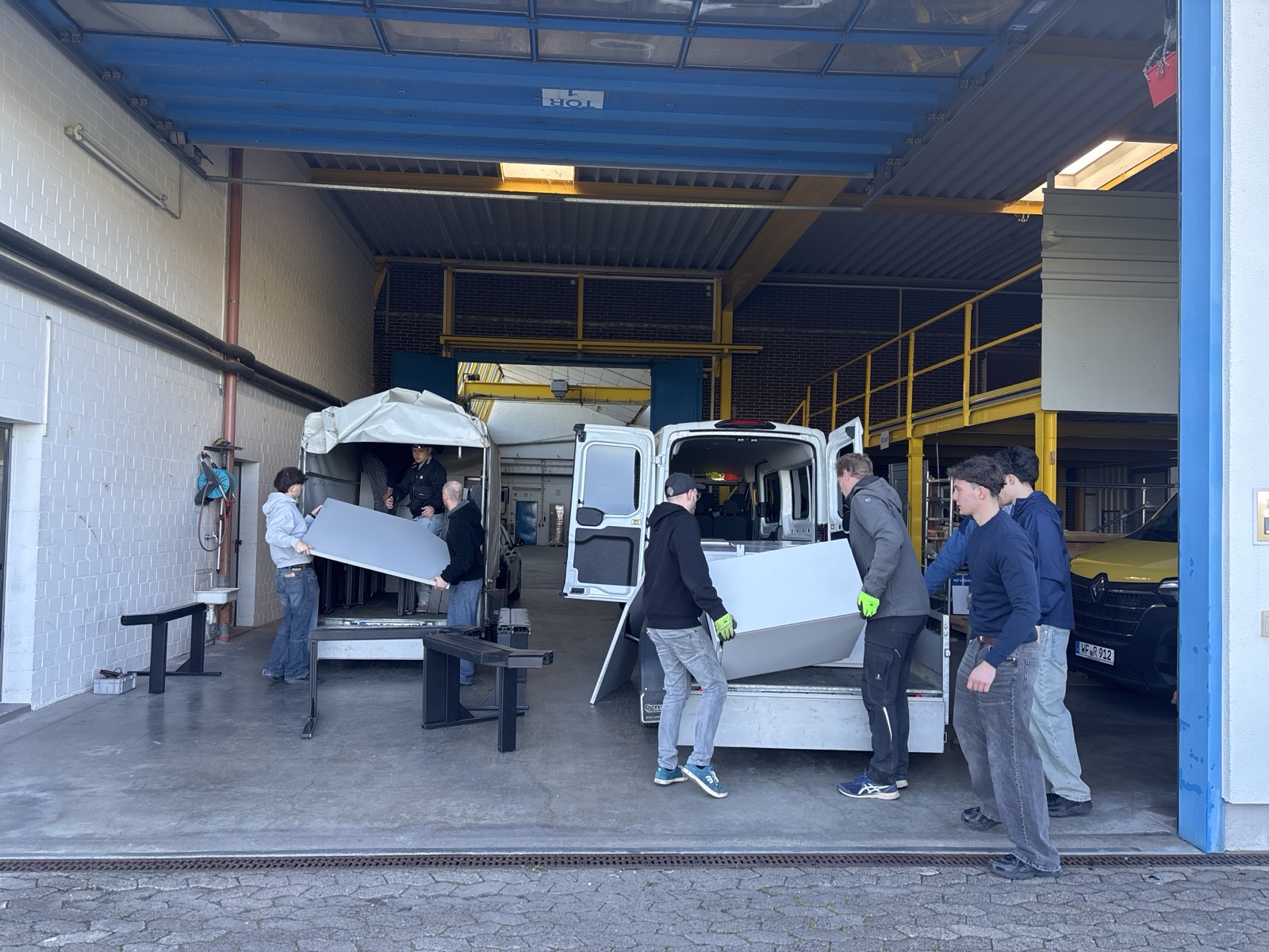 Schon beim Verladen zeigte sich echter Teamgeist – Tische und Container wechselten Hand in Hand und guter Stimmung ihren Platz. Auch der Transport verlief reibungslos, sodass die Möbel wohlbehalten die HBG erreichten.