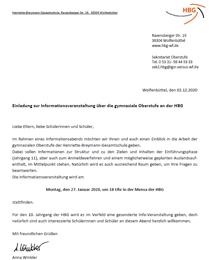 Einladung zur Informationsveranstaltung über die gymnasiale Oberstufe an der HBG am 27.01.2020