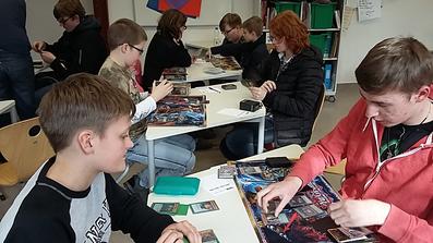 Yu-Gi-Oh ist ein japanisches Sammelkartenspiel, welches ursprünglich im Jahre 1999 aus einer Animeserie entstand und in diesem Stil Figuren aus dieser Fantasiewelt wie Drachen, Ritter, etc. verwendet. Das Prinzip des Spieles ähnelt bekannten Sammelkartenspielen wie z.B: Magic. In einem Yu-Gi-Oh! Duell sitzen sich beide Duellanten gegenüber und spielen mit ihren selbst zusammengestellten Kartendecks von 40 Karten. Ziel des Spieles ist es durch bestimmte Kartenkombinationen die Karten des Gegners auszuspielen und zu kontern. Gewinner eines Duells ist derjenige, der durch seine Monster/Zauber/Fallenkombinationen die Lebenspunkte des Gegners auf 0 reduzieren kann. Yu-Gi-Oh! Ist ein Strategiespiel und lässt sich wohl am besten mit einer Partie Schach vergleichen, bei der man sich die Spielfiguren auf dem Brett selbst zusammenstellen kann. Jede Yu-Gi-Oh! Karte hat wie eine Schachfigur eine bestimmte Funktion. Die Spieler müssen strategisch und problemlösungsorientiert vorgehen um die Schwachstellen dieser Karten mit den ihnen zur Verfügung stehenden Karten auszunutzen. Bei unserem zweiten Treffen mit der IGS Wallstraße spielten 13 Schüler und eine Schülerin um den Sieg.