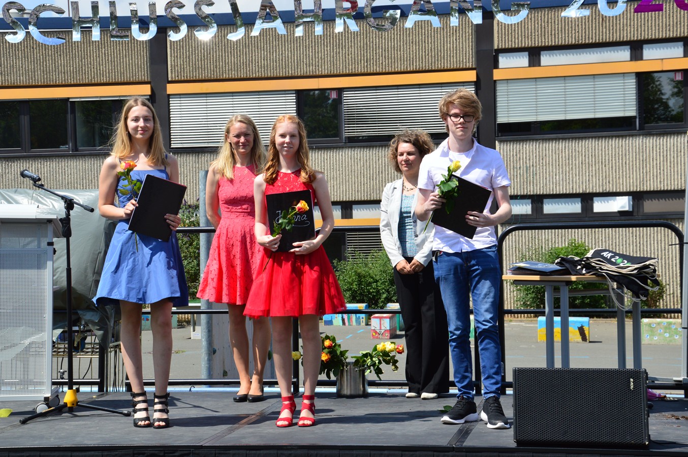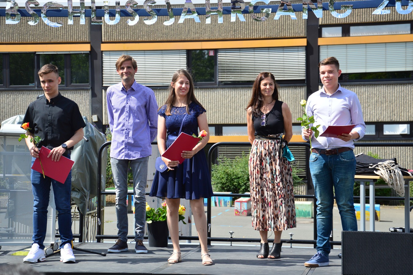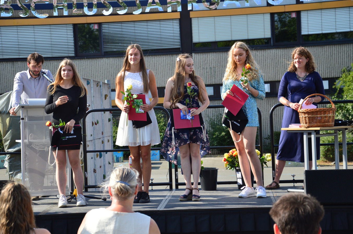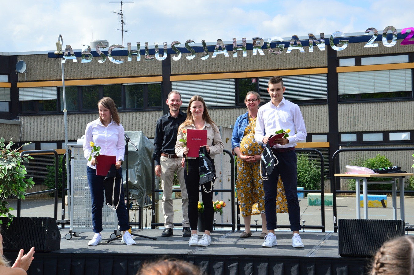 Ganz anders als sonst fand die Zeugnisübergabe jedoch nicht mit dem gesamten Jahrgang in der Sporthalle, sondern in deutlich kleinerem Rahmen innerhalb der Klassen auf dem Schulhof statt. Strahlender Sonnenschein, schick gekleidete Jugendliche und Musik in Form eines Liedes für den Jahrgang sorgten für eine feierliche Stimmung.