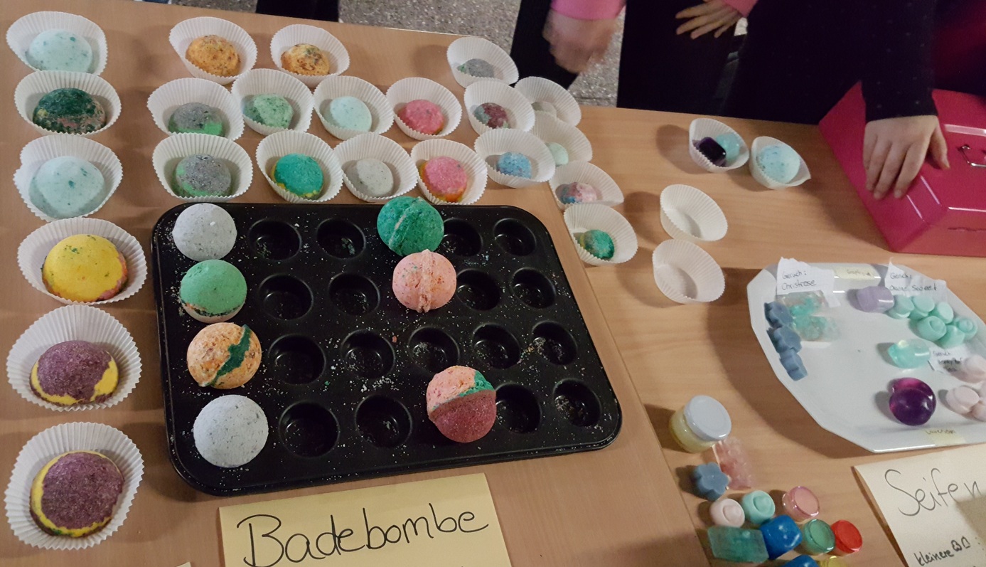 Der MINT "Kosmetik, Seife und Co. selbst herstellen" hat am 17. und 20.12. in der Schule seine Produkte verkauft. Unter anderem fanden Badebomben, Lippenbalsam, Badesalz und Seifen reißenden Absatz, so dass insgesamt 190,95€ eingenommen wurden. Das Geld wurde an das "Kinderhospiz Löwenherz e.V." gespendet - vielen Dank an alle fleißigen Käufer!