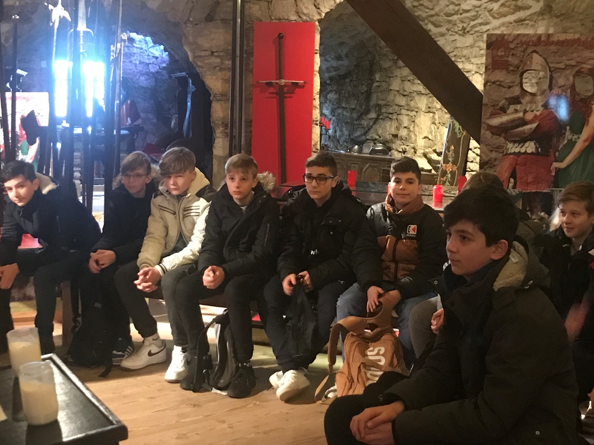 "Die Klasse 7.1 besuchte am 18.12.2019 den Zwinger in Goslar, da „das Mittelalter“ zurzeit unser Thema im Unterricht ist. Die Ansprechpartnerin im Zwinger war Frau Resch, sie hat der Klasse sehr viele spannende Sachen über den Zwinger und das Mittelalter erzählt, z.B. welche Waffen es früher gab und welche Regeln es gab. Wir durften später auch noch die Waffen anfassen und auch mal halten, manche durften sogar ein Kettenhemd anziehen. Außerdem gab es am Ende noch einen Ritterschlag für jeden Schüler. Den Vormittag beendeten wir dann noch mit einem Besuch auf dem Weihnachtsmarkt."