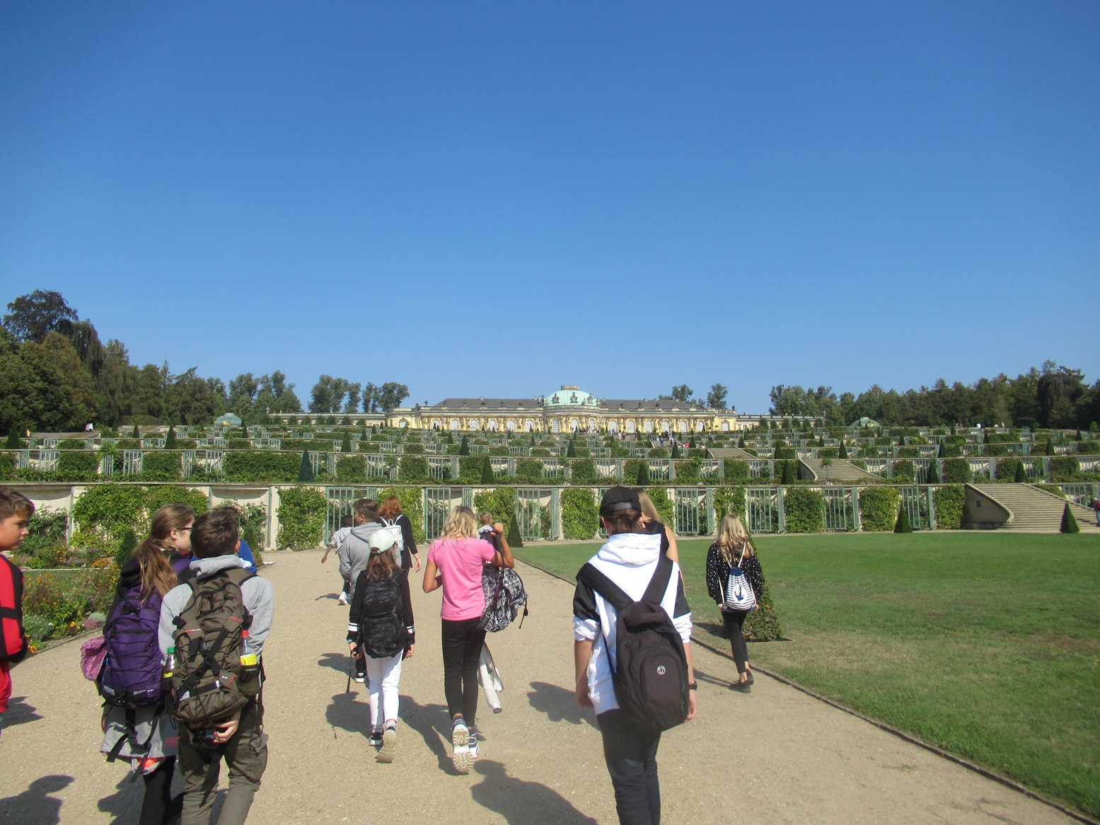 Mit diesem Floß durften wir anschließend auf dem Ruppinersee fahren. Am Mittwoch ist die 7.2 zum Sanssouci in Potsdam gefahren. Dort haben sie eine Schlossbesichtigung gemacht. Nachdem die Besichtigung zu Ende war, wurde die Klasse mit ihrem Reisebus in die Potsdamer Innenstadt gefahren, wo sie 2 Stunden Zeit hatten sich umzuschauen und Geld auszugeben.