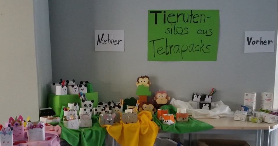 In den klassenübergreifenden Workshops entstanden beispielsweise phantasievolle Tetrapack-Utensilos, bunte Pappmachétiere, tierische Metalluhren, flauschige Pompomtiere und lustige Tieranimationen am Computer.