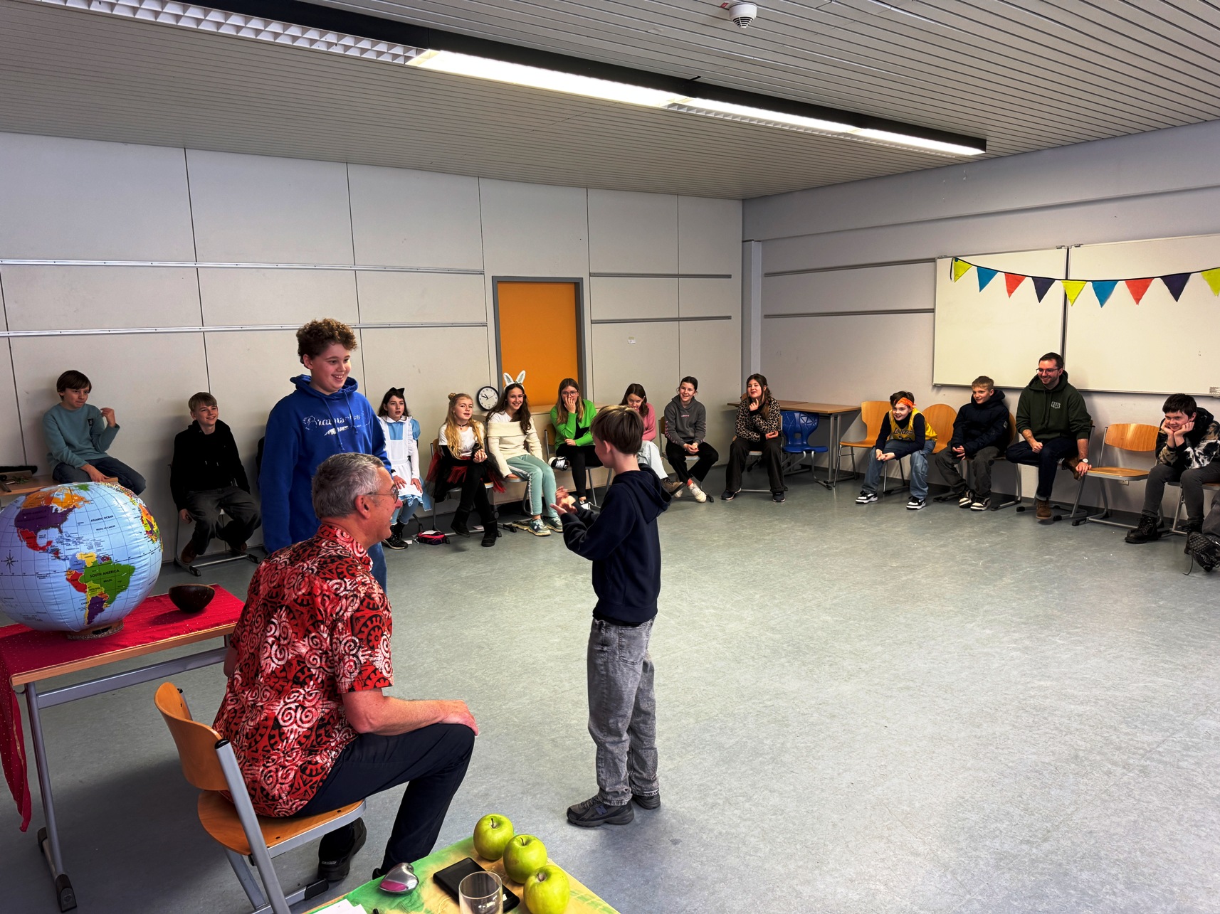 we want to tell you about our day with the storyteller David. David is an English storyteller who tells stories in English from all around the world. His stories are easy to understand because he tells them with his hands and his facial expression. His texts are suitable to the different ages of the students. He tells the stories in grades 5 to 7. They are useful for our studies to learn more English, and with more fun!